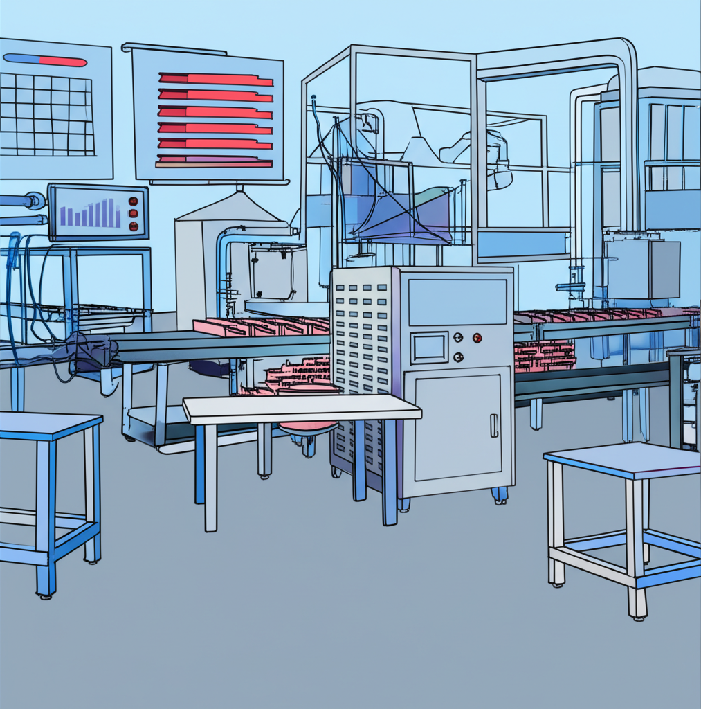 ภาพประกอบโรงงานผลิตเครื่องจักรอุตสาหกรรม ระบบทำความเย็น และเครื่องจักรแปรรูปอาหารพร้อมกราฟหุ้น PK